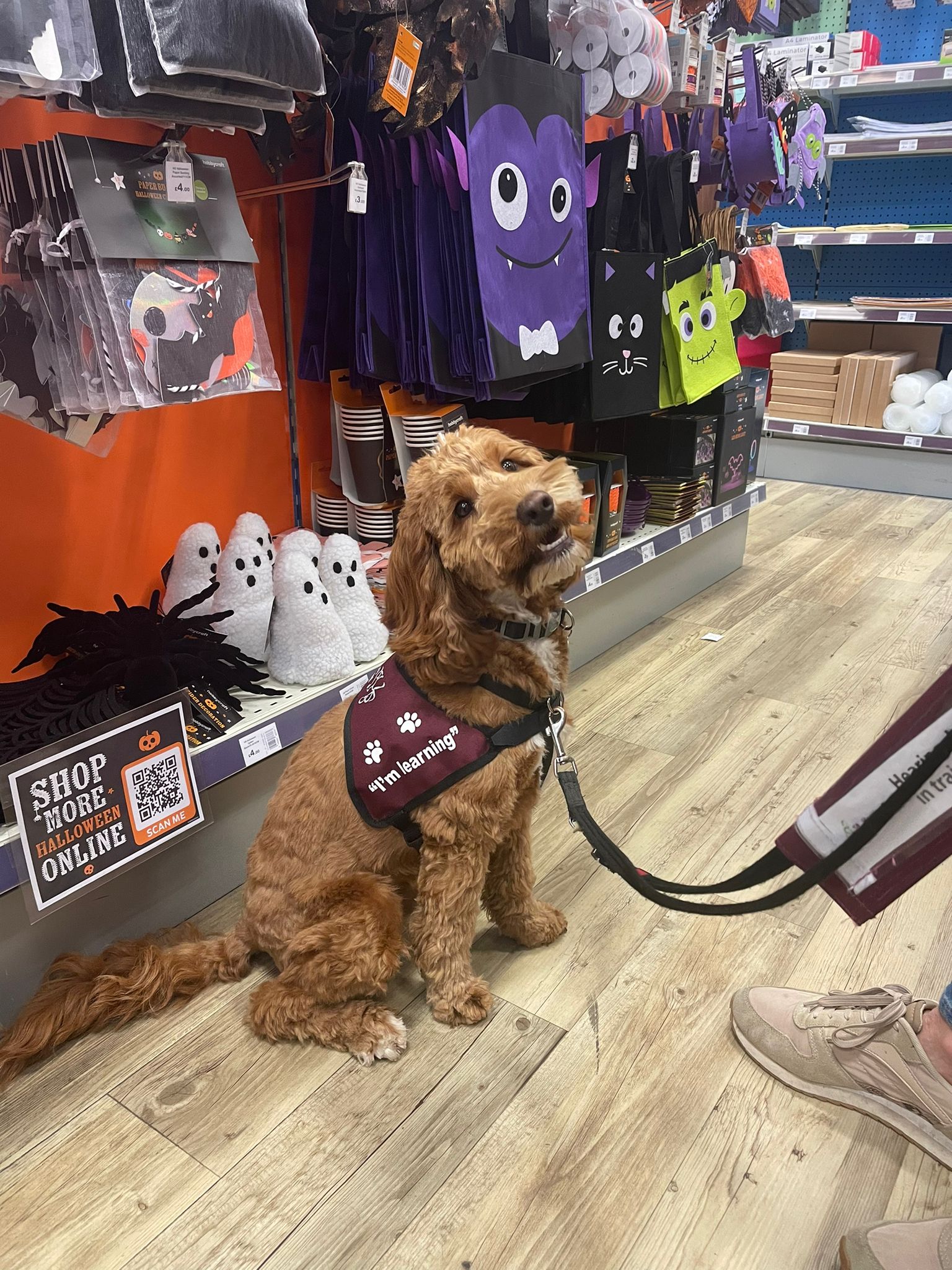 Our clever cocker spaniel will wear his jacket when practising in public places like supermarkets and cafes, as well as when gaining experience on public transport.